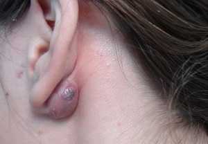 Наиболее распространена атерома кожи, которая может возникать в различных местах – на голове в области волос, лице, шеи, ушей, мочке уха.