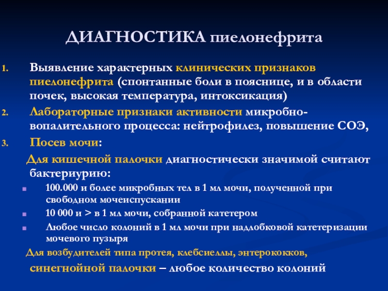 Как правило, диагностика пиелонефрита начинается с изучения врачом жалоб больного и сбора анамнестических сведений.