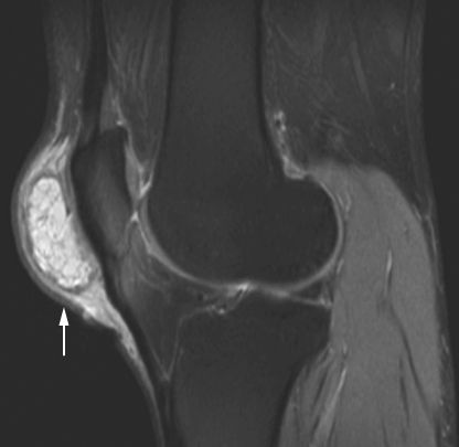 Предпателлярная сумка расположена поверхностно на передней поверхности колена между кожей и надколенником.Бурса не сообщается с коленным суставом, и сам коленный сустав является нормальным при препателлярном бурсите.