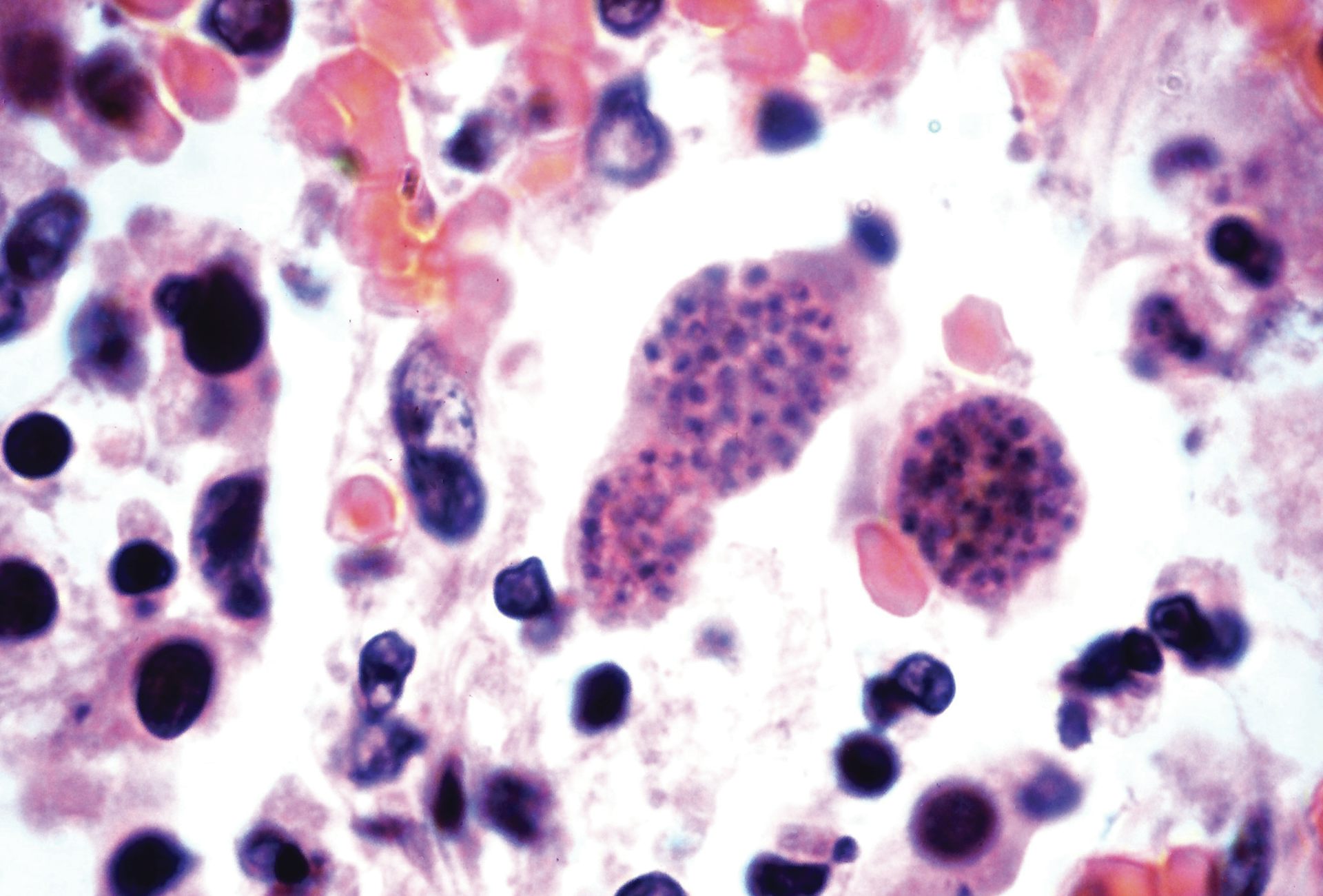При заражении человека T. gondii паразит образует цисты, которые могут поражать практически любую часть тела — чаще всего мозг и мышечную ткань различных органов, включая сердце.