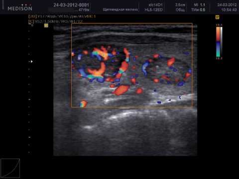 - цветная допплерография (ЦДК). С помощью данного исследования, можно определить направление, в котором движется кровоток в сосудах. При этом, разное направление частиц, отличается по цвету. Синим цветом отображены частицы, двигающиеся в одном направлении. В то время, как красным цветом, выделяется поток частиц в противоположном направлении. При ЦДК, можно с точностью отделить жидкостные образования в железе, от кровеносных сосудов с активным кровотоком. Все эти наблюдения, могут использоваться эндокринологом при постановке диагноза.