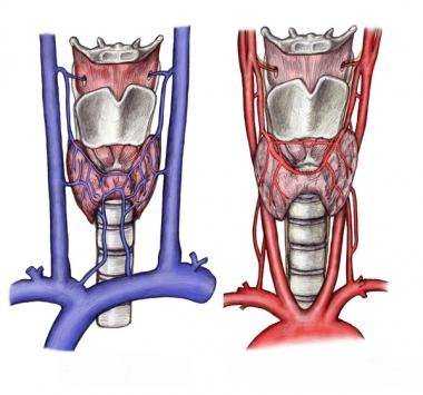 Существуют парные сосуды, которые питают орган: пара нижних и верхних щитовидных артерий. Они подходят к каждой доле органа и кровоснабжают соответствующую ее часть (верхнюю или нижнюю). Артерии разветвляются на множество капилляров, создавая в толще эндокринной ткани густую и мощную сосудистую сеть. По ней в ткань поступает кровь, богатая кислородом и необходимыми элементами, важнейшим из которых для продукции гормонов является йод. К фолликулу (структурно-функциональной единице) подходит отдельный капилляр, таким образом, каждая из клеток (тироцитов) получает все необходимое для синтеза гормонов. Отток крови от органа осуществляется также по парным венам.