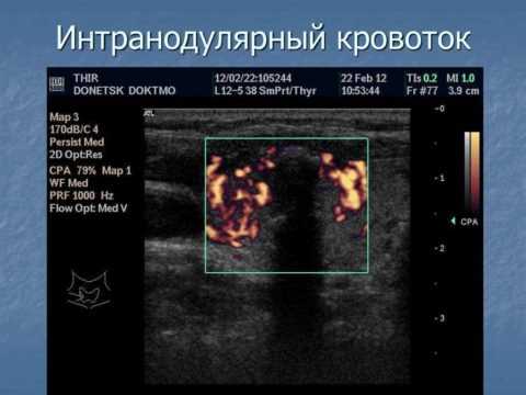 Если кровоток усилен внутри обнаруженного узла, это указывает на отсутствие капсулы, что характерно для злокачественного течения. Когда повышена интенсивность либо в центральной части узла, либо по его периферии это указывает на активно функционирующие новообразования, активно синтезирующие тиреоидные гормоны.