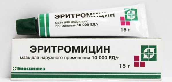 - Эритромициновая 1%. Активное вещество — антибиотик эритромицин. Мазь применяется при бактериальной форме патологии. Показана детям от одного года, применяется трижды в день.