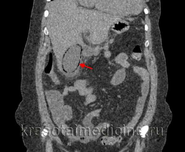 КТ органов брюшной полости. Острый эмфизематозный холецистит – скопление газа по периферии в виде «ободка».