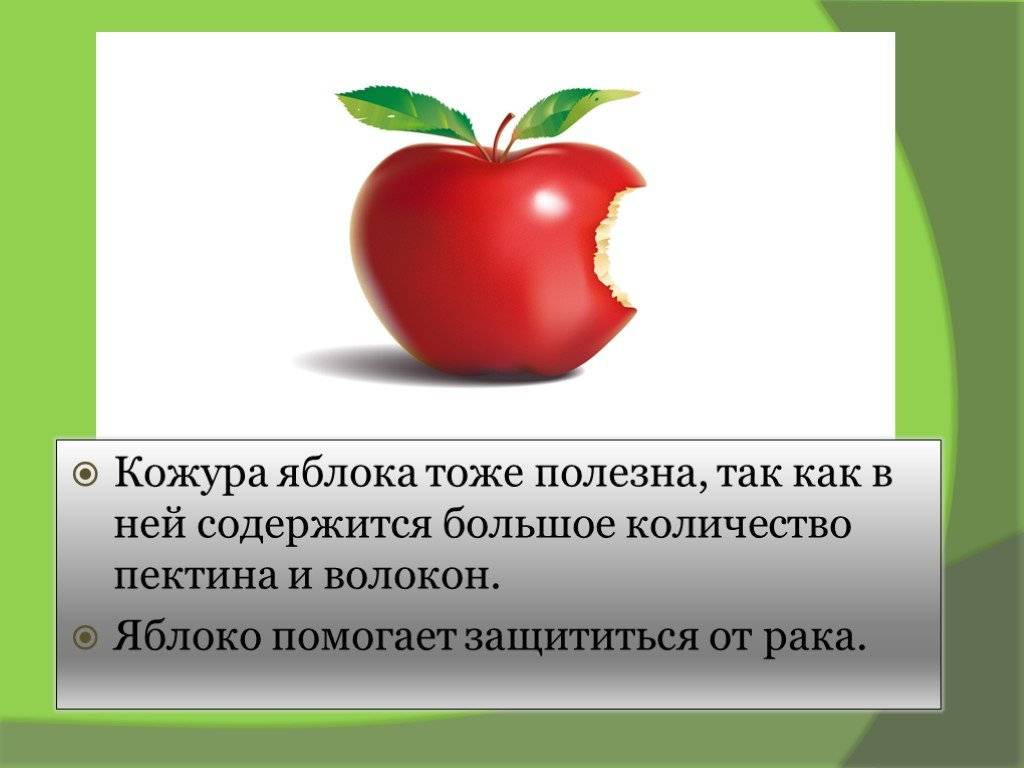- Ученые выяснили, что экстракт из кожуры яблок может замедлять распространение злокачественных клеток при раке толстой кишки на 43 %, в то время как экстракт из мякоти — только на 29 %.