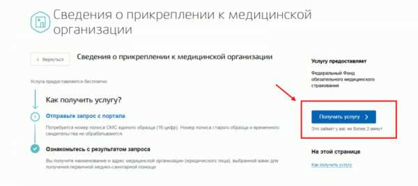 - выбрать услугу: «Сведения о прикреплении к медицинской организации» и получить услугу. Здесь система попросит номер полиса ОМС, если его данные не внесены, номер полиса забивается в имеющееся окошечко, после чего можно нажать поиск.