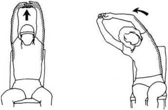 - в положении сидя с прямой спиной глубоко вдыхать, прогибаясь назад, стараясь как можно ближе свести лопатки. Задержаться в этом положении на 5 секунд, при выдохе вернуться в исходную позицию;