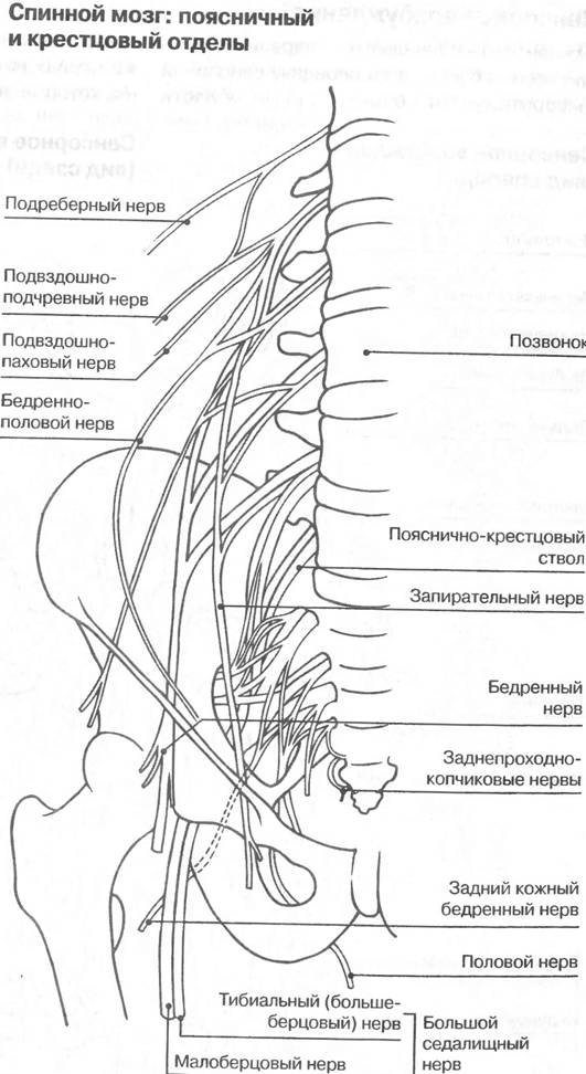 По одному седалищному нерву проходит через ягодицы и бедра, заканчиваясь в области подколенной ямки. Дальше правый и левый седалищный нерв разветвляются на другие нервы, которые спускаются к стопе и пальцам ног.