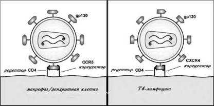 Рецепторы и корецепторы для ВИЧ имеются на поверхности нескольких типов клеток иммунной системы. Наличие С4-рецептора позволяет называть все эти клетки С4-лимфоцитами. В частности, на мембране уже упоминавшихся Т-лимфоцитов-хелперов имеется С4-рецептор и CXCR4-корецептор. С4-рецептор содержится также на поверхности макрофагов и дендритных клеток, которые также одновременно несут и корецептор CCR5 (рис. 9). На ранней стадии ВИЧ-инфекции вирусы обычно имеют большее сродство с макрофагами, поэтому их называют М-троп-ными. Белок оболочки этих вирусов gp120 способен связываться одновременно с С4-рецептором и CCR5-корецептором. На более поздних стадиях ВИЧ приобретает сродство с Т-клетками, поскольку белок gp120 видоизменяется и становится способным связываться с клетками, содержащими как С4-рецептор, так и CXCR4-корецептор. По этой причине такие вирусы называют Т-тропными.
