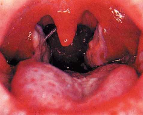 При развитии токсической или гипертоксической форм дифтерии налеты приобретают грязно-серый цвет, распространяются на язычок, мягкое небо, дужки. Шея сильно отекает, возникает интенсивная головная боль, нарастают признаки интоксикации, повышается температура тела до 40°С.