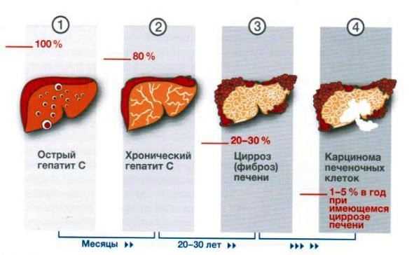 - Длительное и часто бессимптомное течение заболевания. Степень хронизации процесса достигает 80%. Через 15 — 25 лет в 20 — 50% случаев развивается цирроз печени, в 1, 25 — 2,5% случаев — первичный рак печени.