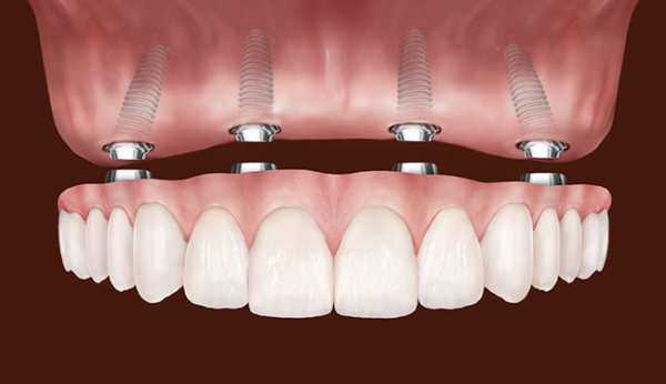 Чтобы жевательная нагрузка была распределена равномерно, пациенту устанавливают 4 импланта в передней части челюсти.
