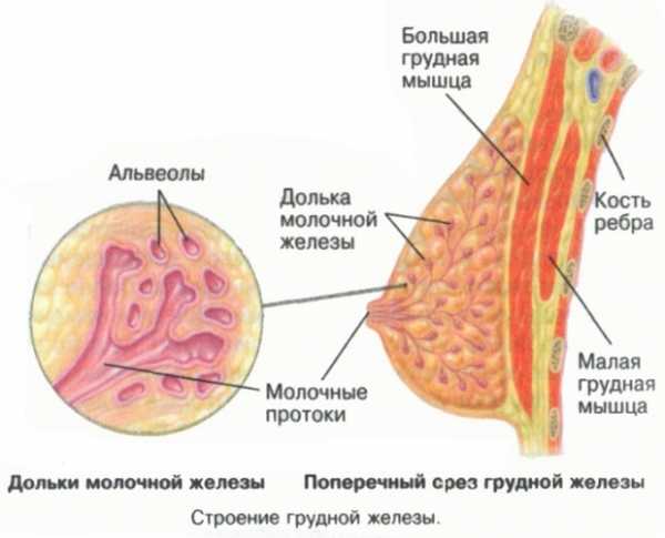 Молочная железа состоит из железистой ткани, которая окружена подкожной жировой клетчаткой. Всю толщу железы разделяют соединительнотканные тяжи, которые разделяют железистую ткань на множество крупных долей (около 20). В груди присутствует большое количество лимфатических и кровеносных сосудов.