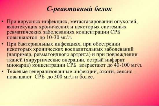 Показателем острого процесса воспаления является белок при ревматизме. Ц-реактивный белок приводит в активное состояние защитные функции организма. Уровень белка резко повышается в первые пять-шесть часов после проникновения инфекции и возникновения воспаления. Вовремя проведенный анализ ревмопроб важен при контроле хронической формы заболевания. В состоянии ремиссии белок в кровяной плазме почти отсутствует, в случае рецидива уровень СРБ снова растет.
