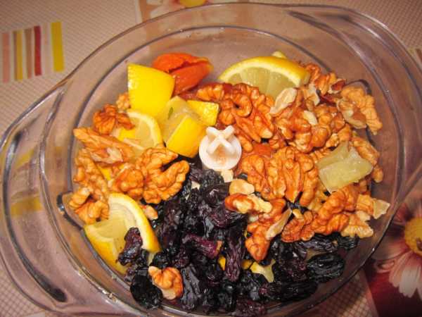 - Перекрутить на мясорубке чернослив, изюм, курагу, грецкие орехи, каждого вида по 300 грамм. Добавить 300 гр. меда и сок одного лимона. Принимать по одной столовой ложке в день за 15 минут до приема пищи, курс один месяц. Такой рецепт порадует детей, страдающих нарушением микрофлоры.