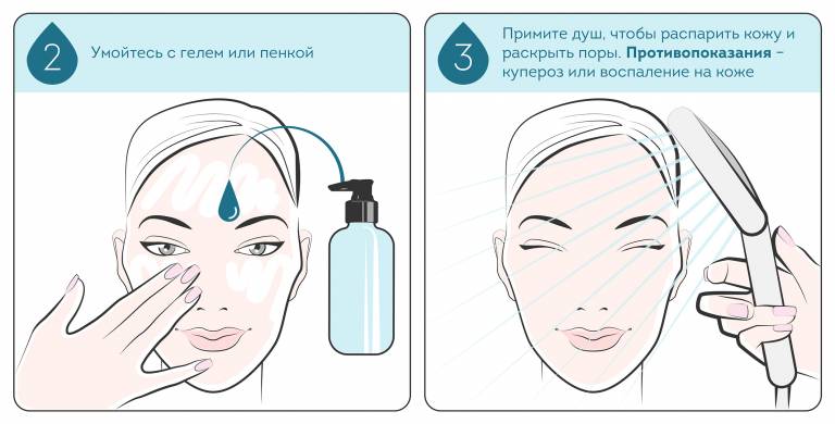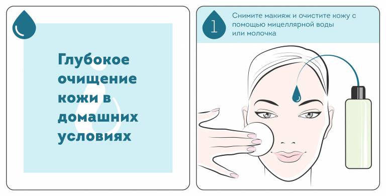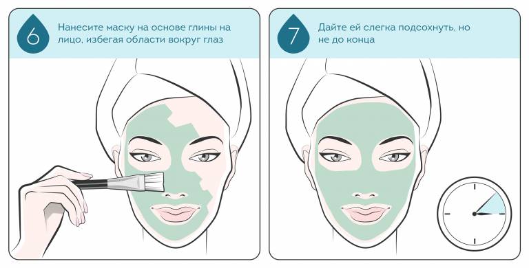 Умывание с помощью геля или пенки для жирной или проблемной кожи и тонизирование. Один или два раза в неделю рекомендовано глубокое очищение с помощью масок на основе глины (примерная схема такого очищения приведена ниже).
