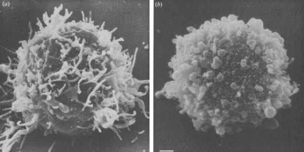 Для сравнения: вот так здоровая клетка отличается от больной (слева — здоровый лимфоцит).